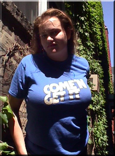 I think it's important to have photos where you can say "DAMN I HAVE BIG THINGIES!!!" This one is one of mine. The only thing missing is hard nipples. Zack took this photo June 17, 1999. It's his shirt and every time I see it I can't help but put it on and make him take a photo of me in it. For those of you with short term memories or other countries, It obviously wasn't a great success but damn this shirt is Groovey Baby! |